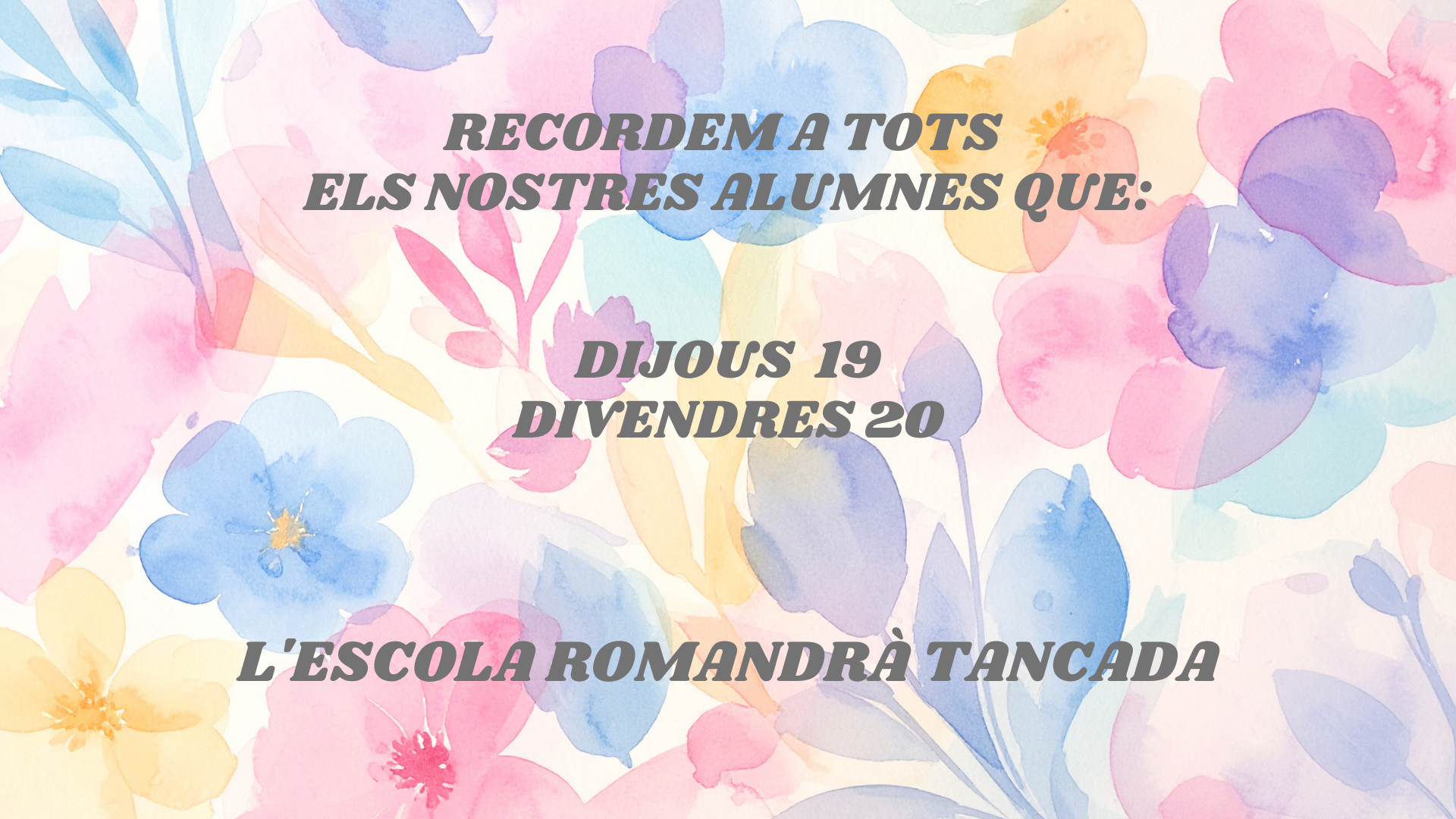 RECORDEM A TOTS ELS NOSTRES ALUMNES QUE: DIJOUS 19 DIVENDRES 20 L’ESCOLA ROMANDRÀ TANCADA