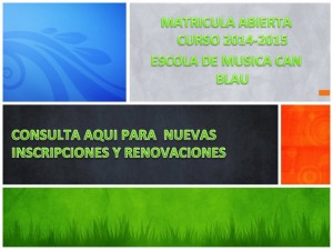 Renovación de matrícula: El lunes, 19 de mayo 2014, empezamos con las renovaciones de matrículas para el año escolar 2014-15. Los impresos de la renovación de matricula o préstamo de instrumento podéis descargar de la página www.canblau.net o recogerlo en horario de oficina de lunes a miércoles de 16h a 20h, jueves y viernes de 10.00h a 14.00h. Rogamos que nos devolváis la renovación de matrícula antes del 6 de junio de 2014. El 1 de…