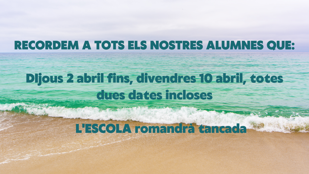 RECORDAMOS A TODOS NUESTROS ALUMNOS QUE LA ESCUELA PERMANECERA CERRADA DEL 2 DE ABRIL AL 10 DE ABRIL, AMBAS FECHAS INCLUIDAS.