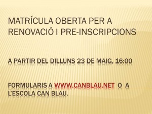 Renovaciones e inscripciones nuevos alumnos curso 2016/17 A partir del 23 mayo al 23 de junio podéis presentar en la oficina el formulario de renovación e inscripciones de nuevos alumnos. Las renovaciones de alumnos tienen que traer el ingreso bancarios del pago de la matricula o realizarlo con tarjeta en el momento de la presentación del formulario. Las inscripciones de nuevos alumnos se realizaran en las fechas anteriormente indicadas y no realizaran el pago de matrícula hasta que no vean…